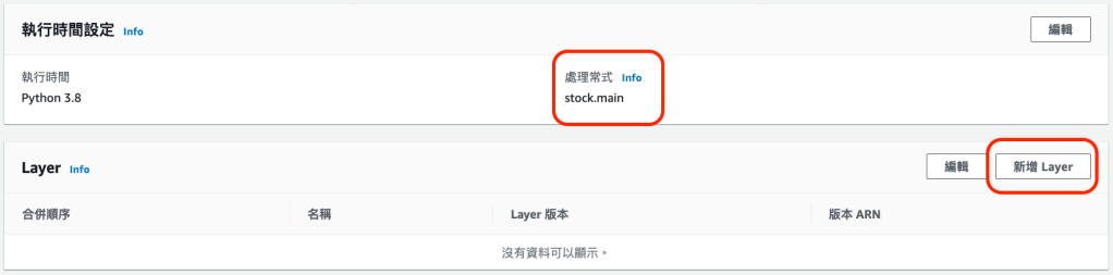 函式的「處理常式」必須設定為 <pyfile_name>.<function_name>,所以我就要將原本預設的變更為 stock.main, 如下圖,設定完成後點選「新增 Layer」