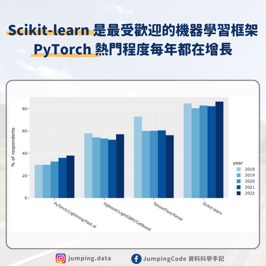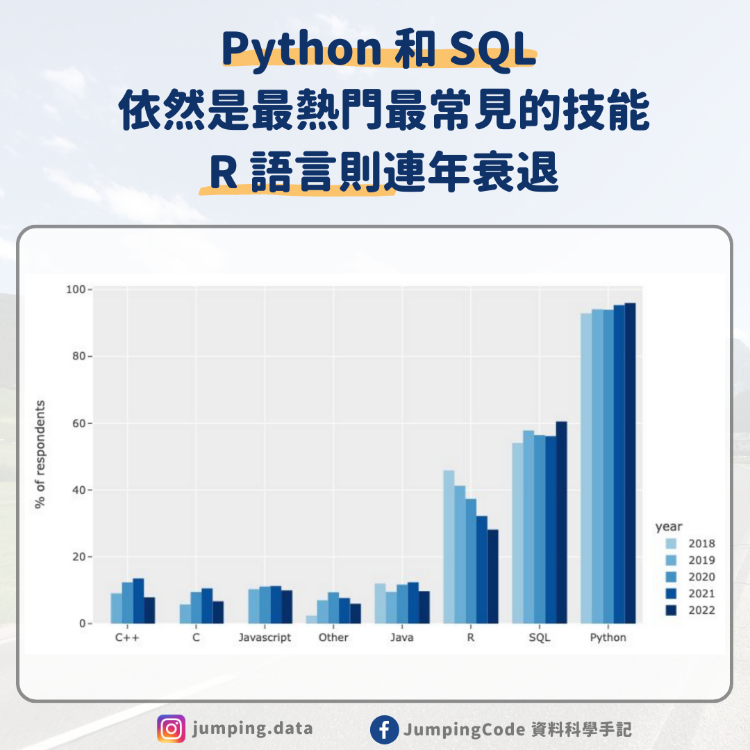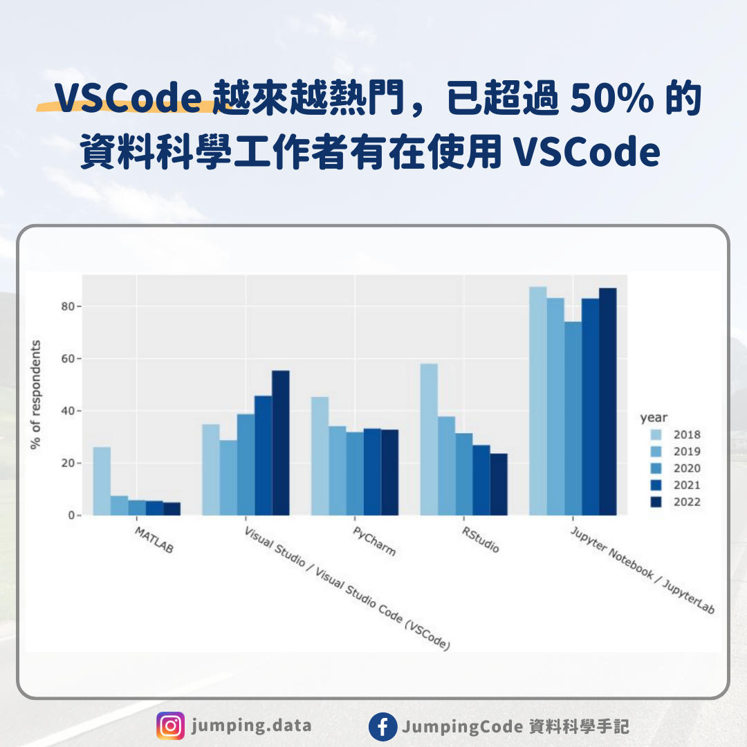除了資料科學慣用的 Jupyter Notebook 之外,VSCode 越來越熱門,已超過 50% 的 資料科學工作者有在使用 VSCode