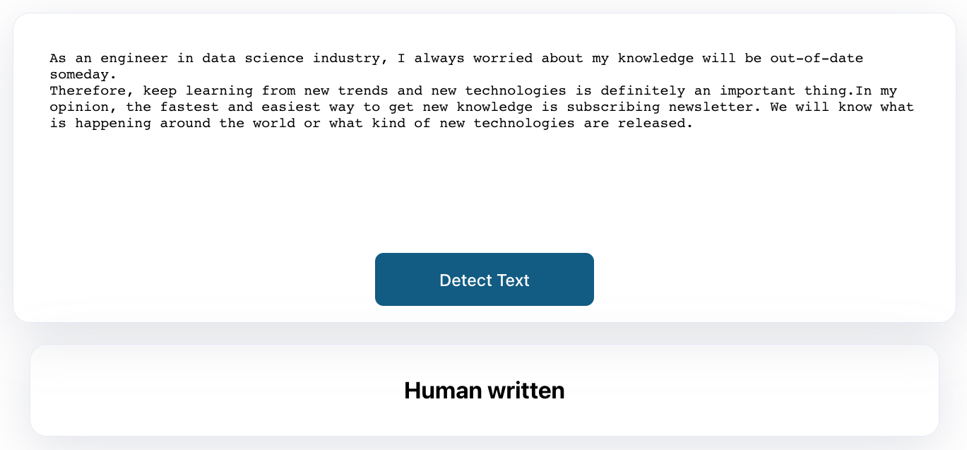 可以輸入中文去測試,但是我拿自己的寫的會顯示是 AI 寫的,雖然網站上面說有支援多語言,但感覺準確度掉了很多。