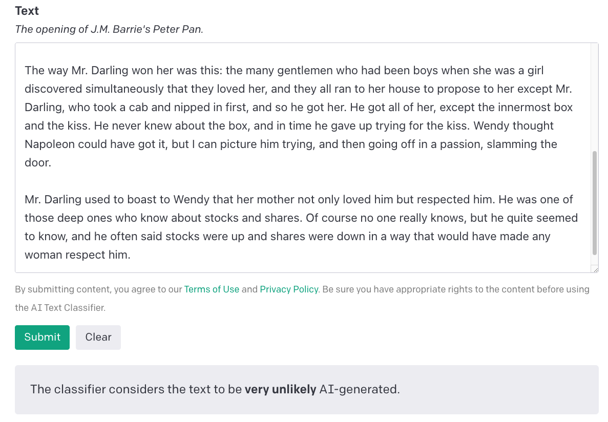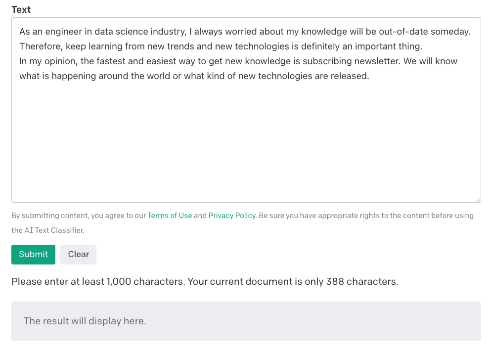 AI Text Classifier 連結:https://platform.openai.com/ai-text-classifier