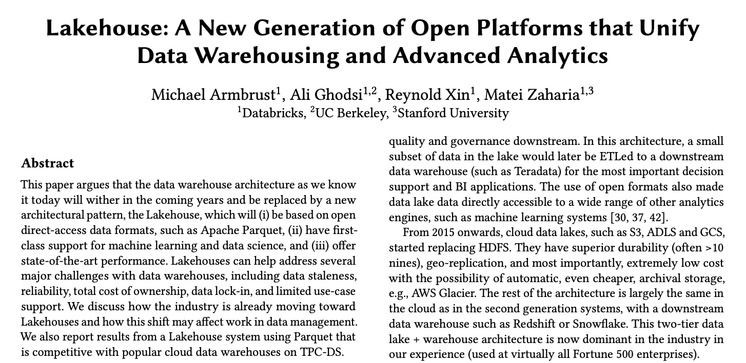 最近對於 Data Lakehouse 滿感興趣也很看好它,覺得 Data Lakehouse 有機會成為將來數據架構的主流,而最早提出 Data Lakehouse 這個專有名詞的目前看起來是 2020~2021 年 Databricks, UC Berkeley 和 Stanford University 所共同撰寫的一篇論文「Lakehouse: A New Generation of Open Platforms that Unify Data Warehousing and Advanced Analytics」,因此這次文章我整理了論文中提到的數據架構變遷歷史與原因,以及 Data Lakehouse 究竟有哪些優缺點、解決了哪些現在各大企業所面臨的問題。