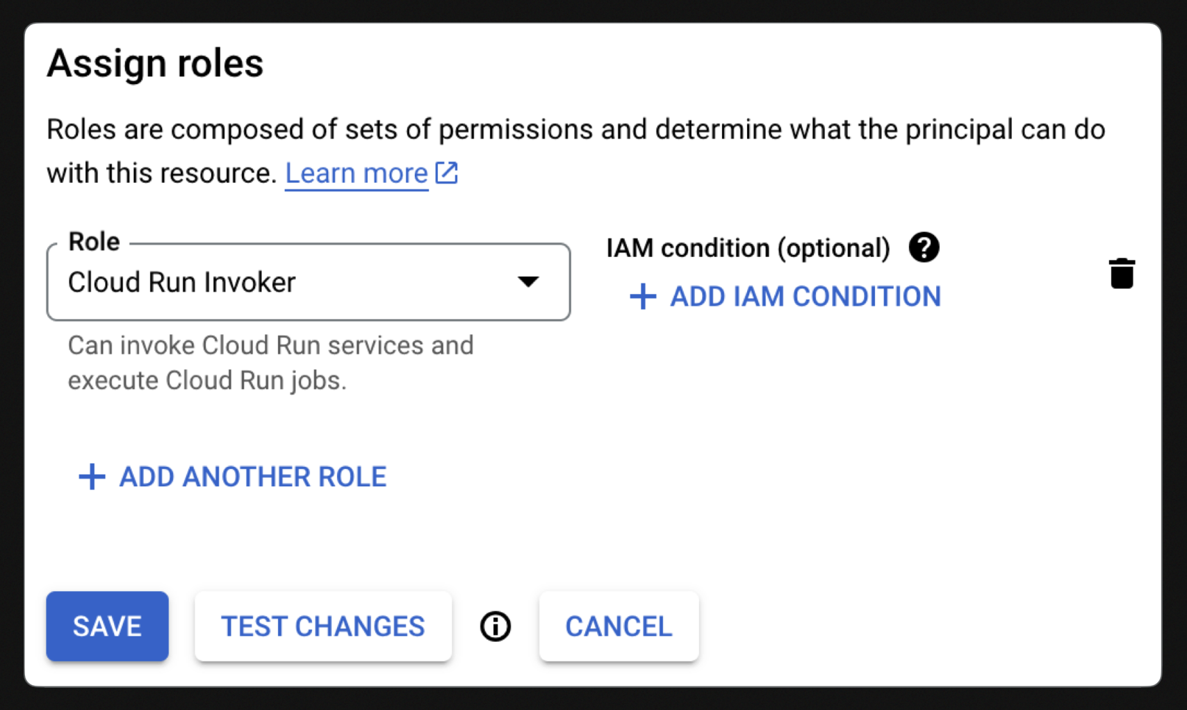 接著可以點擊「+ ADD PRINCIPAL」新增需要權限的帳戶/Gmail,給予 Cloud Run Invoker 這個 role,只要有這個權限就可以呼叫 Cloud Run Service(此步驟需要 Project Owner 權限的人來操作)